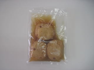 新しいお惣菜ができました。がんもの中に鶏ひき肉・きくらげなどを詰めた煮物です。袋のままお湯で温めて盛り付ければ、やさしい味わいの一品のできあがりです。